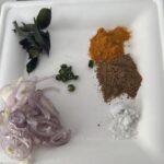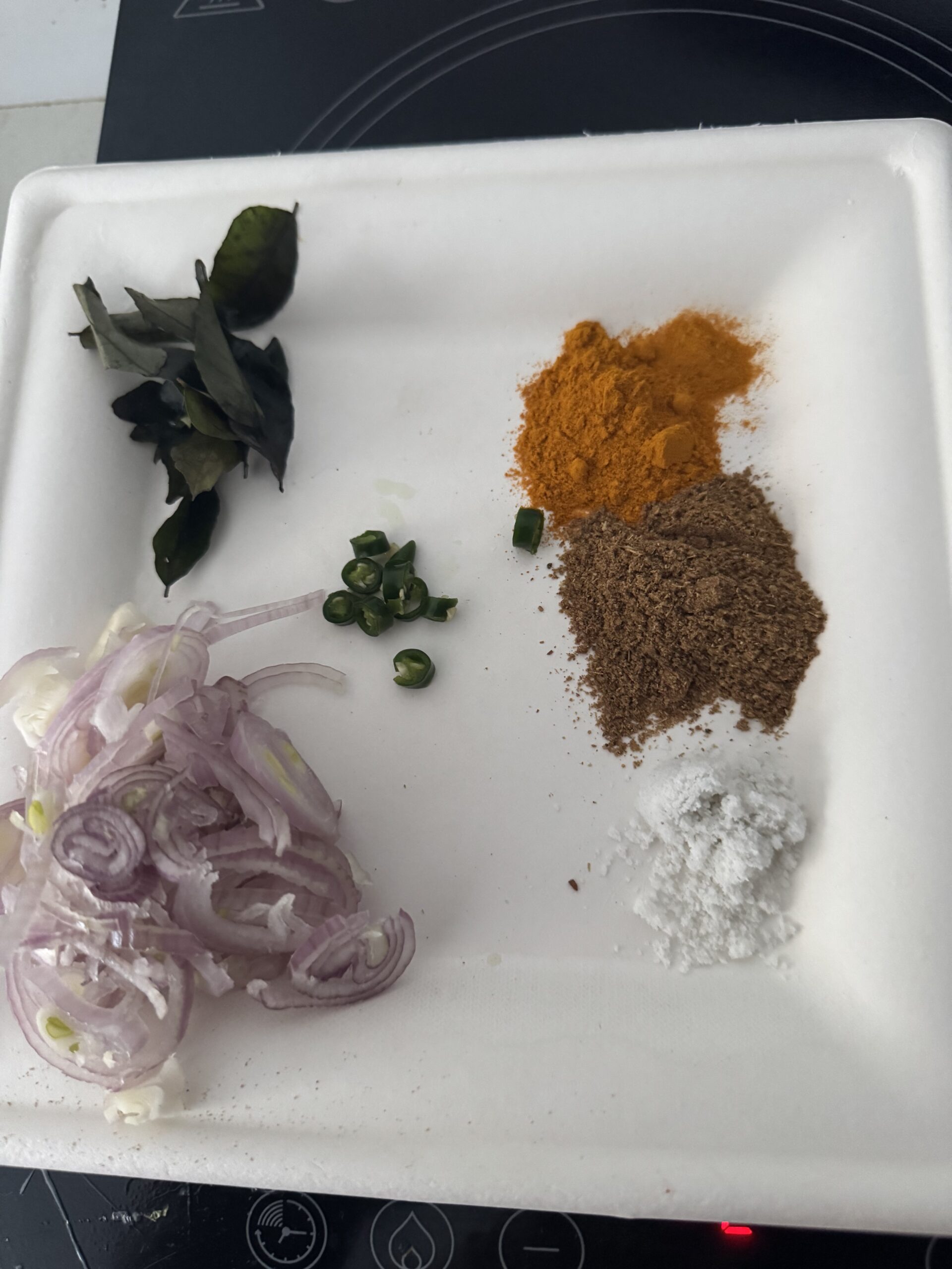• Dans une grande poêle bien chaude avec un filet d’huile, faites revenir l’échalote, les piments verts et les feuilles de curry pendant 2 à 3 minutes.