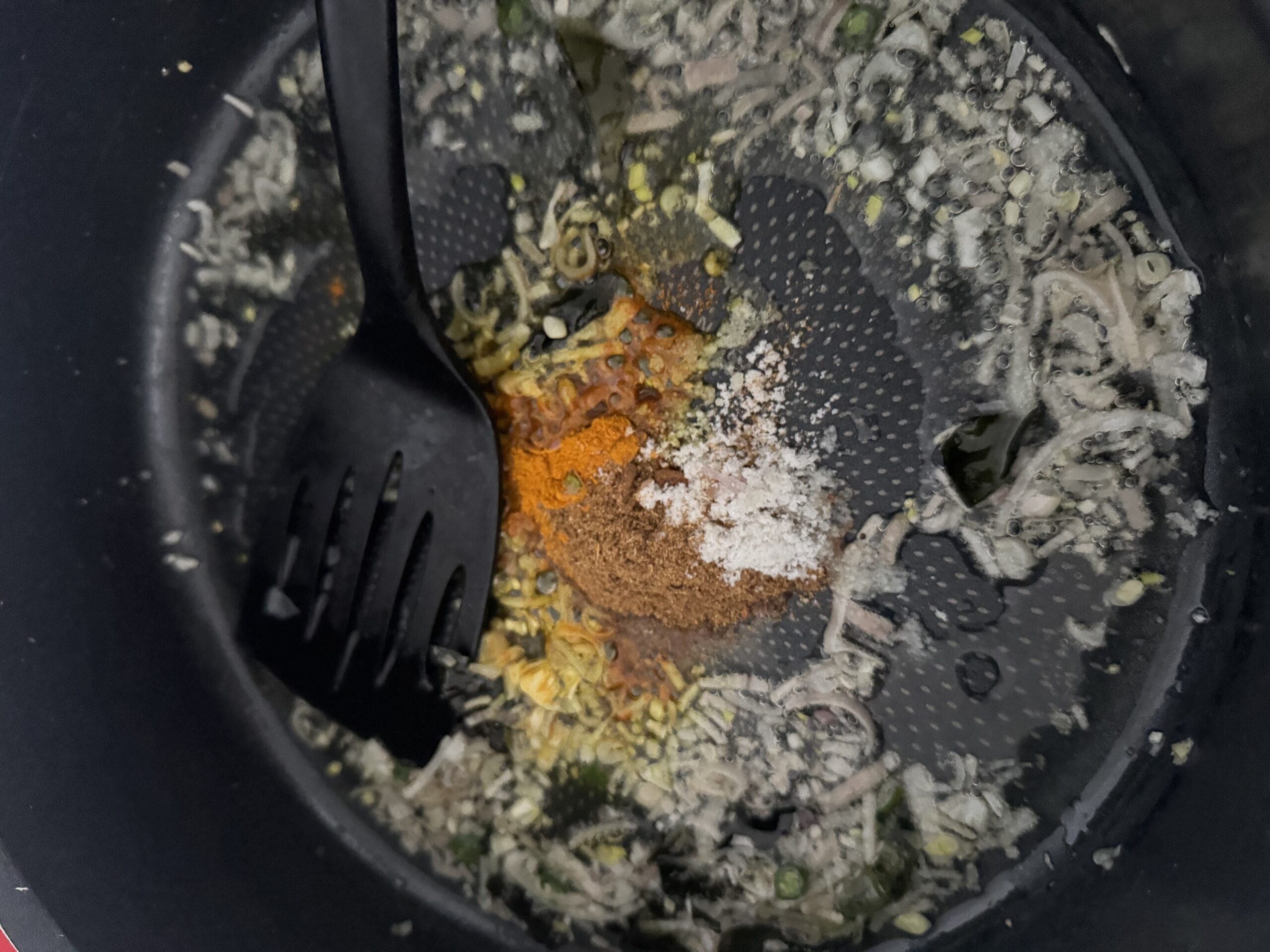 • Incorporez le curcuma, le garam masala et le sel. Mélangez bien.
