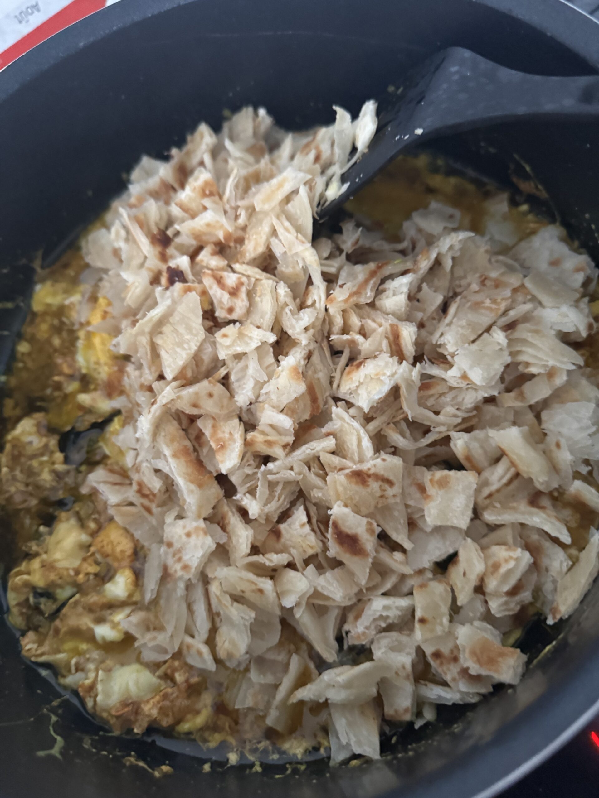 • Ajoutez les morceaux de parotha et mélangez énergiquement pour bien les enrober du mélange.