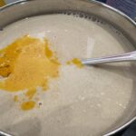 • Dans un bol, mélangez 400 ml d’eau + 250 ml de lait de coco + 1 càc de curcuma.