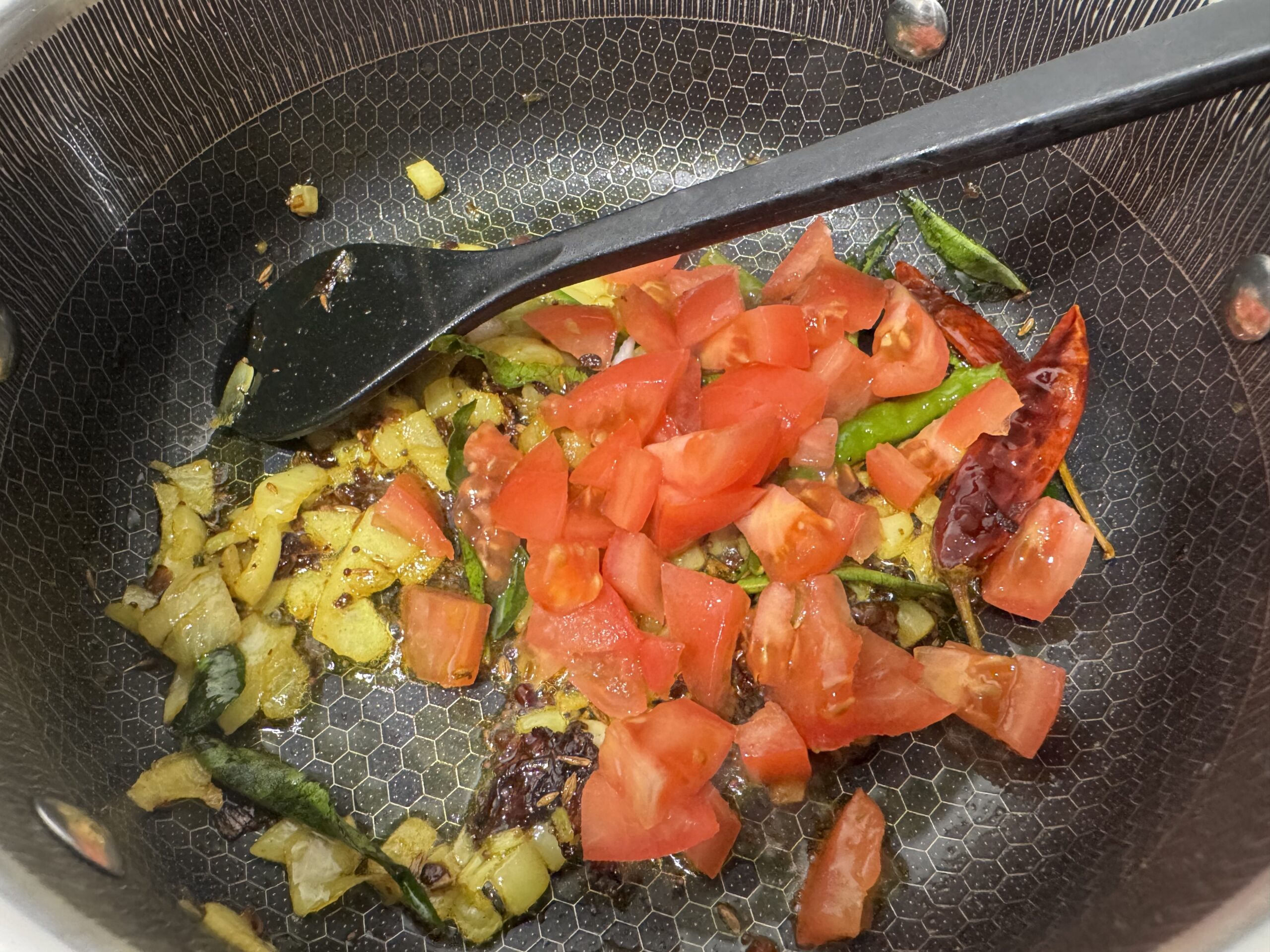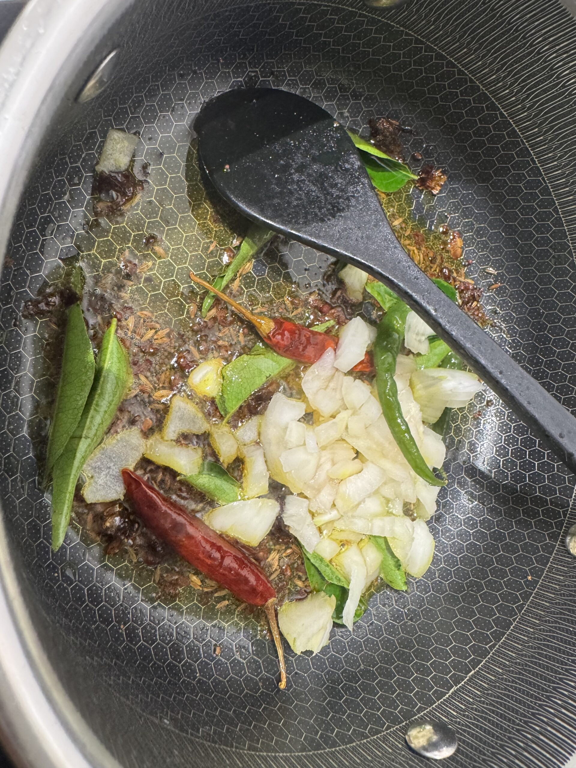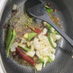 • Ajoutez l’oignon et les piments verts, faites revenir jusqu’à ce que l’oignon soit translucide.